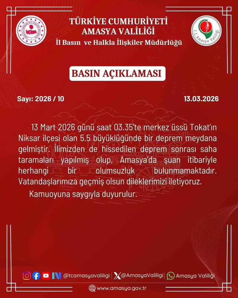 Amasya Valiliği, merkez üssü komşu il Tokat’ın Niksar ilçesi olan 5.5 büyüklüğündeki depremin ardından bir açıklama yaptı. Deprem, 13 Mart 2026 günü saat 03.35’te meydana geldi ve Amasya'dan da hissedildi.