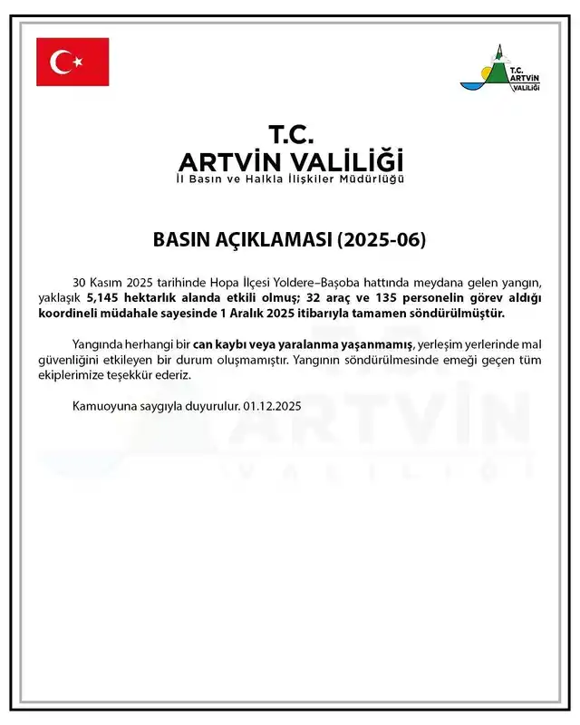 Artvin Valiliği tarafından yapılan açıklamada, Hopa ilçesinde Yoldere-Başoba hattında 30 Kasım’da meydana gelen orman yangınının söndürüldüğü belirtildi. Açıklamada, yangının yaklaşık 5,145 hektarlık alanda etkili olduğu, 32 araç ve 135 personelin koordineli müdahalesiyle 1 Aralık itibarıyla tamamen kontrol altına alındığı belirtildi. Açıklamada yangında herhangi bir can kaybı veya yaralanma yaşanmadığı, yerleşim yerlerinde de güvenliği tehdit eden bir durumun oluşmadığı ifade edildi.