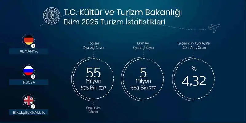 "Ekim ayında en çok ziyaretçi gönderen ülkeler arasında Almanya ve Rusya Federasyonu ilk iki sıradaki yerini korurken, Birleşik Krallık üçüncü sırada yer aldı. Almanya’dan gelen ziyaretçiler yüzde 6,20, Rusya Federasyonu’ndan gelen ziyaretçiler ise yüzde 11,44 oranında artış gösterdi. Yılın ilk on ayında toplam ziyaretçi sayımız 55 milyon 676 bin 237, yabancı ziyaretçi sayımız ise 47 milyon 252 bin 314 oldu. Bu ziyaretçilerin yüzde 96,20’sinin kültür, gezi ve tatil amacıyla ülkemizi tercih etmesi, Türkiye’nin global turizmdeki güçlü konumunu bir kez daha teyit ediyor. Türkiye; turizm çeşitliliği, hizmet kalitesi ve dünya çapındaki marka değeriyle yükselen bir başarı grafiği çizmeye devam ediyor."