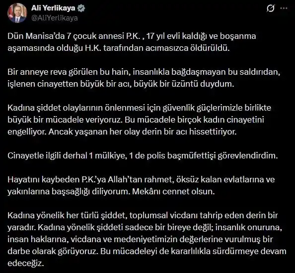 İçişleri Bakanı Yerlikaya, sosyal medya hesabından Manisa’da 7 çocuk annesi P.K.’nın 17 yıl evli kaldığı ve boşanma aşamasında olduğu H.K. tarafından öldürülmesine ilişkin yaptığı açıklamada, "Bir anneye reva görülen bu hain, insanlıkla bağdaşmayan bu saldırıdan, işlenen cinayetten büyük bir acı, büyük bir üzüntü duydum. Kadına şiddet olaylarının önlenmesi için güvenlik güçlerimizle birlikte büyük bir mücadele veriyoruz. Bu mücadele birçok kadın cinayetini engelliyor. Ancak yaşanan her olay derin bir acı hissettiriyor. Cinayetle ilgili derhal 1 mülkiye, 1 de polis başmüfettişi görevlendirdim. Hayatını kaybeden P.K.’ya Allah’tan rahmet, öksüz kalan evlatlarına ve yakınlarına başsağlığı diliyorum. Mekânı cennet olsun. Kadına yönelik her türlü şiddet, toplumsal vicdanı tahrip eden derin bir yaradır. Kadına yönelik şiddeti sadece bir bireye değil; insanlık onuruna, insan haklarına, vicdana ve medeniyetimizin değerlerine vurulmuş bir darbe olarak görüyoruz. Bu mücadeleyi de kararlılıkla sürdürmeye devam edeceğiz" dedi.