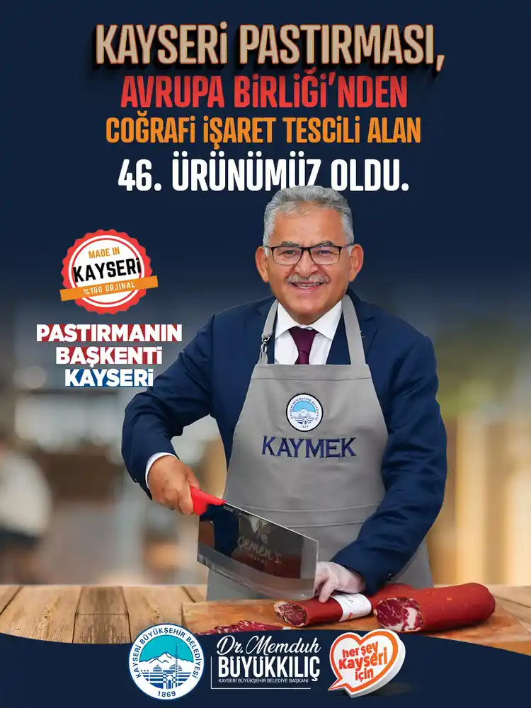 Kayseri Büyükşehir Belediye Başkanı Dr. Memduh Büyükkılıç; Kayseri Pastırması’nın Avrupa Birliği’nden coğrafi işaret tescili aldığını duyurdu. Başkan Büyükkılıç, Kayseri Pastırmasının Türkiye’nin AB’den coğrafi işaret tescili alan 46’ncı ürünü olarak listede yerini alması sürecindeki gayretlerinden dolayı Tarım ve Orman Bakanı İbrahim Yumaklı ile TOBB Başkanı Rifat Hisarcıklıoğlu’na teşekkür etti.