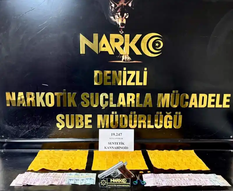 Denizli İl Emniyet Müdürlüğü Narkotik Suçlarla Mücadele Şube Müdürlüğü ekipleri, kentte uyuşturucu ticareti yaptığı tespit edilen şahıslara yönelik operasyon gerçekleştirdi. Yapılan istihbari çalışmalar sonucunda, uyuşturucu madde satışı yapıldığı belirlenen bir ikamete baskın düzenlendi. Adreste ve uyuşturucu temin eden üç şahsın üzerinde yapılan aramalarda, 5 parça halinde 19 bin 247 kullanımlık kağıda emdirilmiş sentetik kannabinoid uç maddesi, 1 adet ruhsatsız tabanca ve tabancaya ait 1 adet şarjör, Uyuşturucu ticaretinden elde edildiği değerlendirilen 9.750 TL nakit para, sentetik madde kesiminde kullanıldığı değerlendirilen bir makas ele geçirildi.