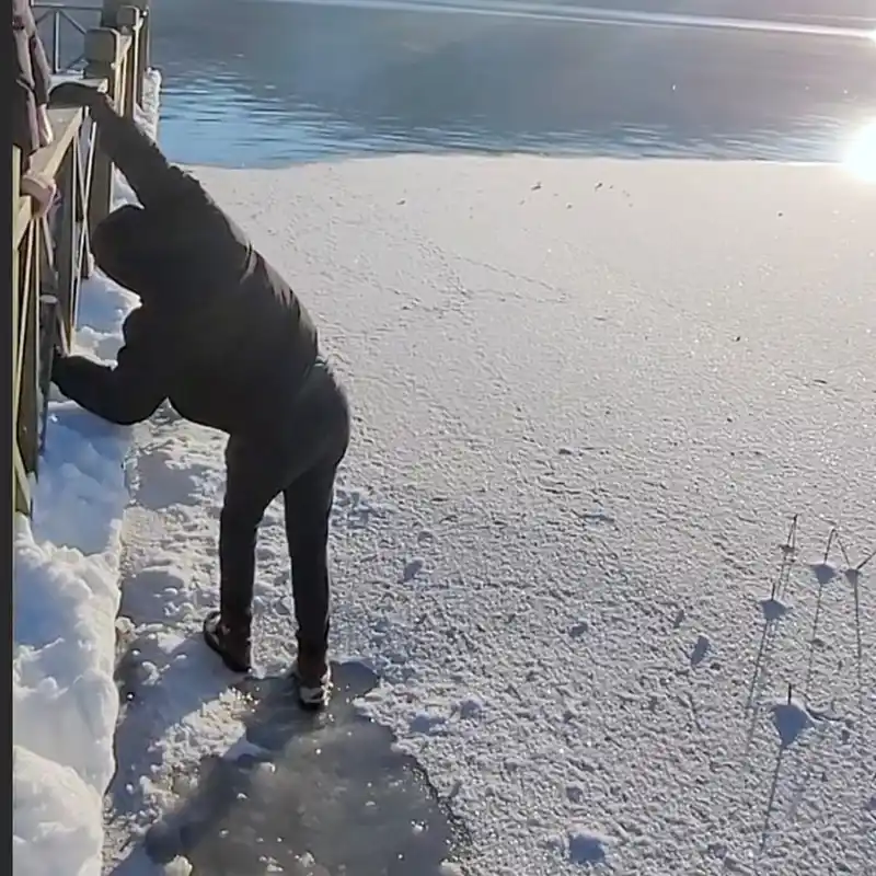 Çevredeki vatandaşların bakışları arasında tehlikeli yürüyüşünü sürdüren genç, bir anda bastığı buz tabakasının kırılmasıyla neye uğradığını şaşırdı. Ani kırılma sonucu suya düşme tehlikesi geçiren genç, elleriyle sıkıca tutunduğu çitler sayesinde buzlu suya düşmekten son anda kurtuldu. Yaşanan bu gerilimli anlar, orada bulunan bir vatandaşın cep telefonu kamerasına yansıdı.