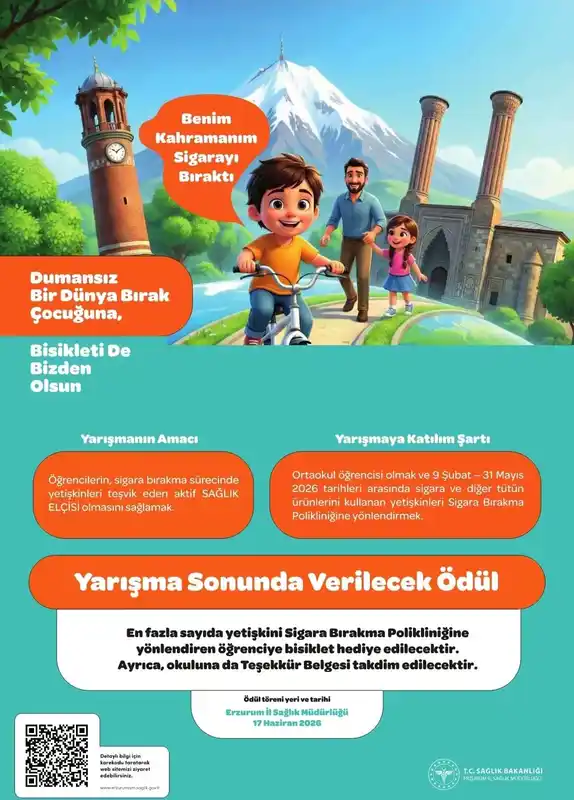 Erzurum İl Sağlık Müdürlüğü, çocuk ve gençlerde sigara karşıtı bir bilinç oluşturmak ve yetişkinleri sigarayı bırakmaya teşvik etmek amacıyla anlamlı bir yarışma başlattı. "Benim Kahramanım Sigarayı Bıraktı-Dumansız Bir Dünya Bırak, Bisikleti de Bizden Olsun" sloganıyla düzenlenen proje, ortaokul öğrencilerini kapsıyor.
