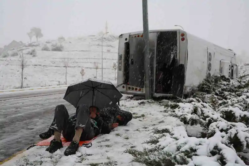 Nevşehir’de işçileri taşıyan servisin takla atması sonucu 14 kişi yaralanırken, yaralılardan biri sağlık ekiplerinin gelmesini şemsiye ile uzanarak bekledi.