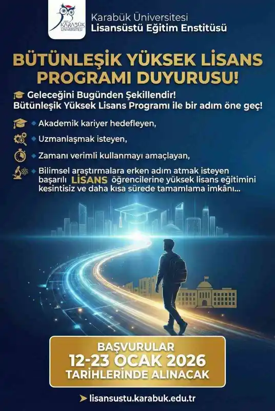 Karabük Üniversitesi'nde bütünleşik yüksek lisans programı için başvurular 12-23 Ocak 2026 tarihleri arasında alınacak. Program, KBÜ Lisansüstü Eğitim Enstitüsü tarafından yürütülüyor ve başarılı öğrencilerin yüksek lisans sürecine erken aşamada dahil olmasını hedefliyor.