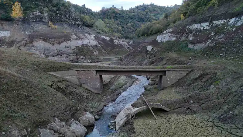 Düşük su seviyesi nedeniyle baraj havzasındaki eski köprü ve yapılar yeniden görünür hale geldi. Dron ile barajın kuraklığı havadan görüntülendi.