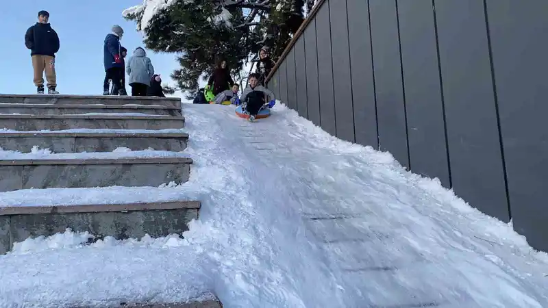 Ellerine şambrel, poşet ve kızaklarını alan minikler, İzzet Baysal Caddesi'ndeki Kent Meydanı'na akın etti. Merdivenleri kaplayan kar, doğal bir rampa oluşturmuştu. Çocuklar, bu rampayı kayak pisti olarak kullanarak doyasıya eğlendi ve karın keyfini çıkardı.