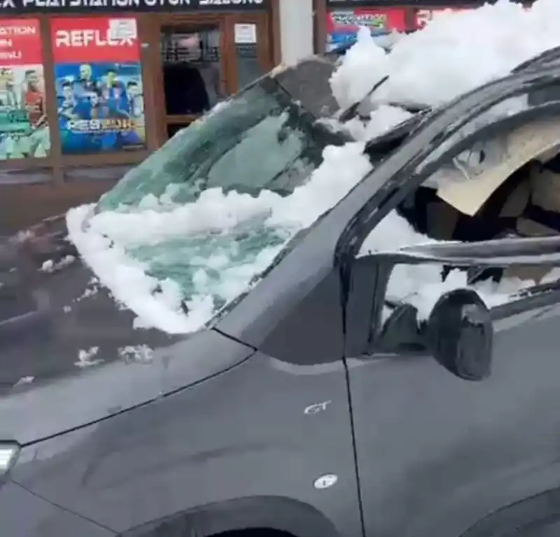 Bitlis’te park halindeki bir aracın üzerine çatıda biriken kar kütlesi düştü.