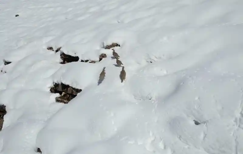 Şırnak’ın Beytüşşebap ilçesinde dondurucu soğuklar ve kar nedeni ile doğal yaşam alanlarında yiyecek bulamayan keklikler sürü halinde sıcak alanlara inip yiyecek aradı.