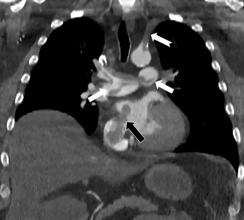 Yapılan ileri görüntüleme tetkikleri, hastadaki hayati tehlikenin kaynağını net bir şekilde gösterdi. Akciğerin bilgisayarlı tomografi anjiyografisi, toplar damarlardan kaynaklanan bir pıhtının akciğer damarlarını tıkamasının yanı sıra, daha önce fark edilmemiş bir kalp deliğinden (atrial septal defekt) geçerek kalbin sağ tarafından sol tarafına ulaştığını ve ana atardamara girerek sol kol damarını tıkadığını ortaya çıkardı. Bu durum, 'paradoks emboli' olarak adlandırılan ciddi bir tabloydu.