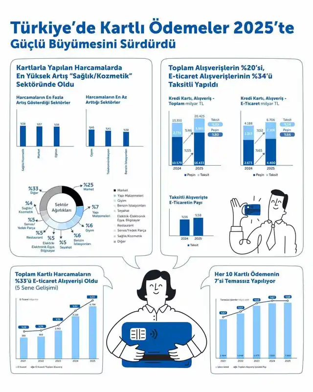 2025 yılında e-ticaret hacmi 6 trilyon 706 milyar TL'ye ulaşırken, toplam kartlı alışverişler içindeki payı %32,8 oldu. Sektör bazında bakıldığında, e-ticaret harcamalarının payının en yüksek olduğu alanlar seyahat (%57), elektrik-elektronik eşya ve bilgisayar (%51) ve yapı malzemeleri (%46) olarak öne çıktı.
