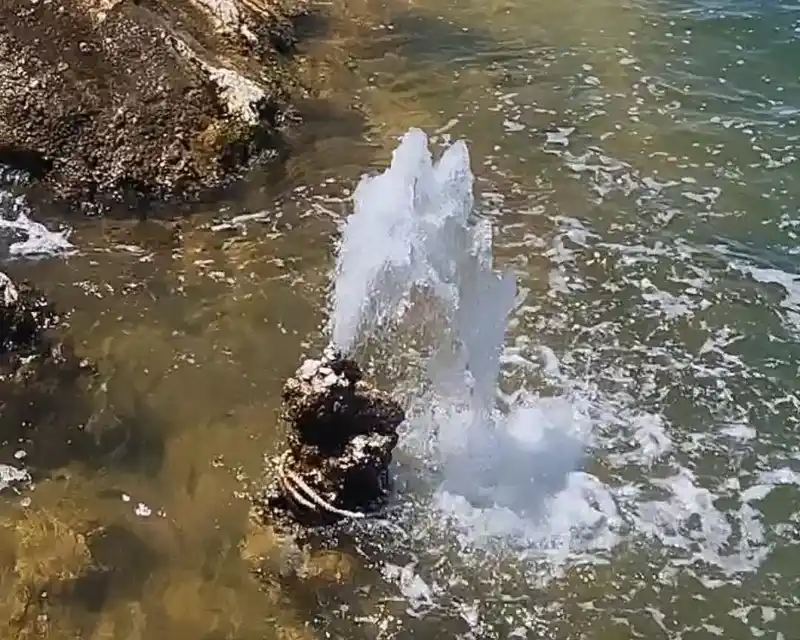 Van Gölü’nün çekilmesiyle Gevaş’ta gün yüzüne çıkan bir mikrobiyalitte fışkırır şekilde görülen su çıkması, görenleri hayrete düşürüyor.