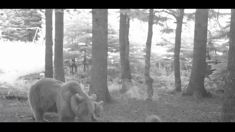 Uludağ'da fotokapanla kaydedilen görüntülerde, yavru bozayının ailesinin peşinden koşması herkesi gülümsetti.